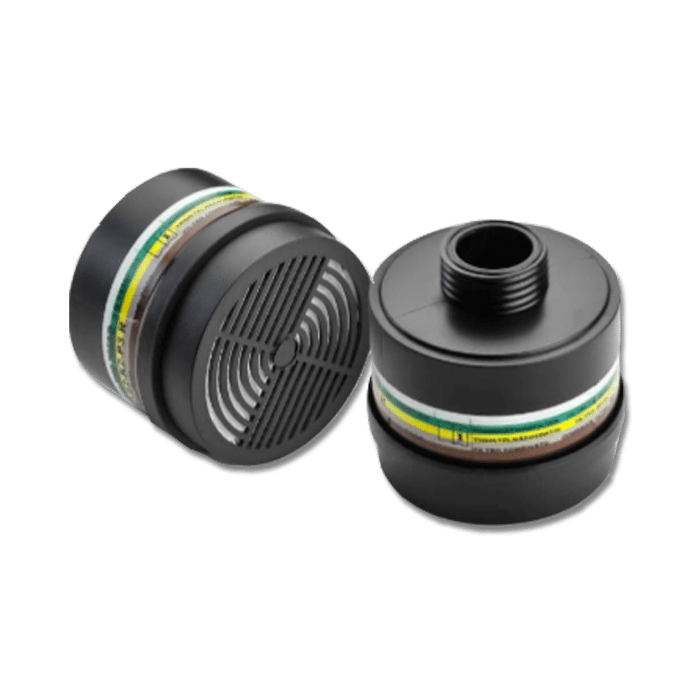 Filtrante antigas con attacco filettato normalizzato EN148-1,per gas e vapori organici con punto di ebollizione superiore a 65°C, gas inorganici, gas acidi, Anidride Solforosa (SO2), Ammoniaca (NH3) e suoi derivati organici.